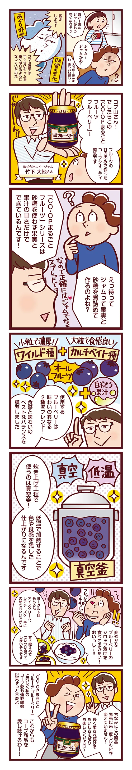 第21話「CO・OPまるごとフルーツブルーベリー」2026.01.06 ※ジャムは日本農林規格(JAS)で次の定義があり、本商品は砂糖などは不使用のため、ジャムではなく「スプレッド」と呼称。 1. 果実、野菜又は花弁を砂糖類、糖アルコールまたは蜂蜜とともにゼリー化するようになるまで加熱したもの。 2. 1.に酒類、かんきつ類の果汁、ゲル化剤、酸味料、香料などを加えたもの。 バックナンバーはこちら