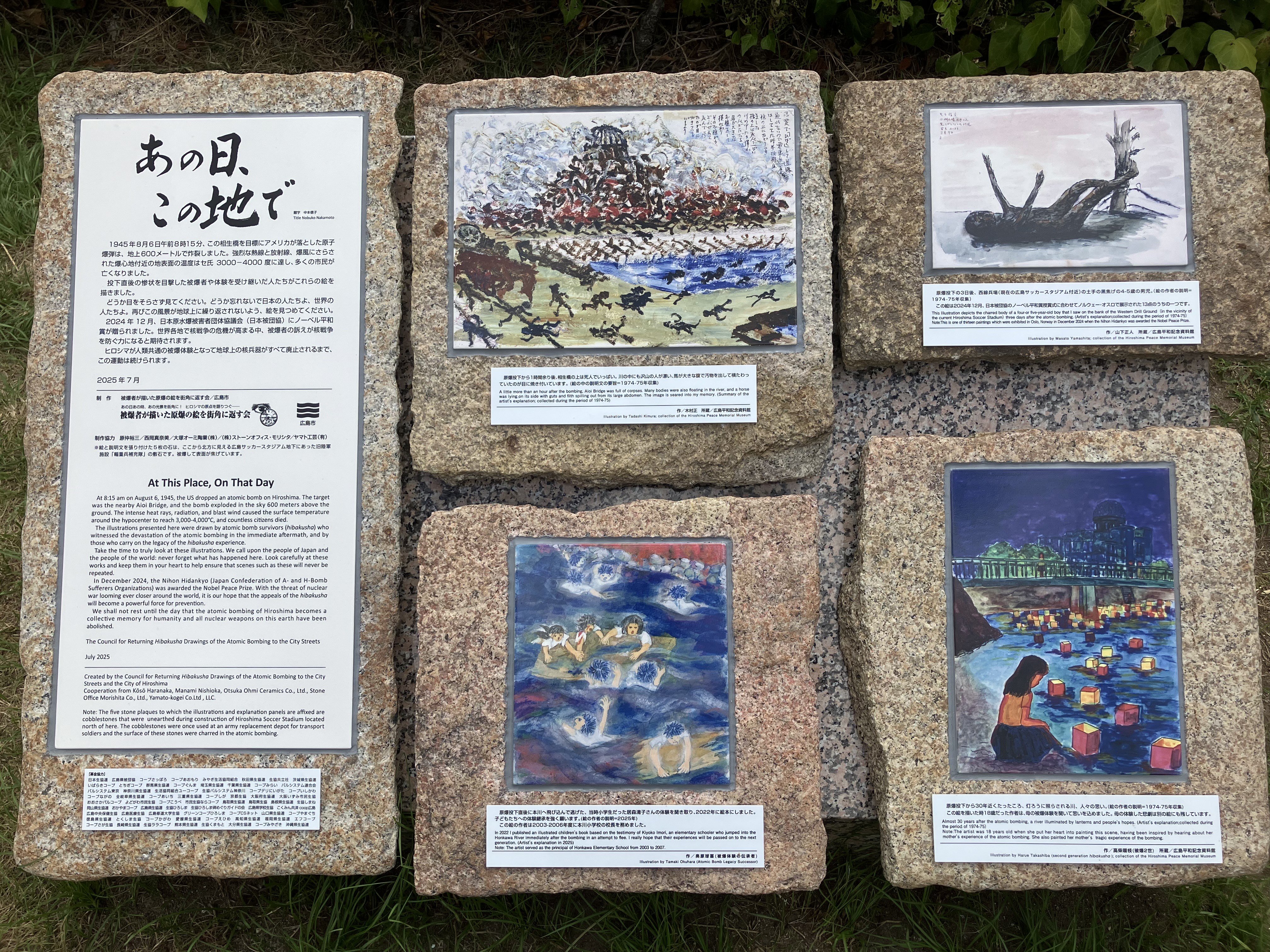 Note: The five stone plaques to which the illustrations and explanation panels are affixed are cobblestones that were unearthed during construction of Hiroshima Soccer Stadium located north of here. The cobblestones were once used at an army replacement depot for transport soldiers and the surface of these stones were charred in the atomic bombing.