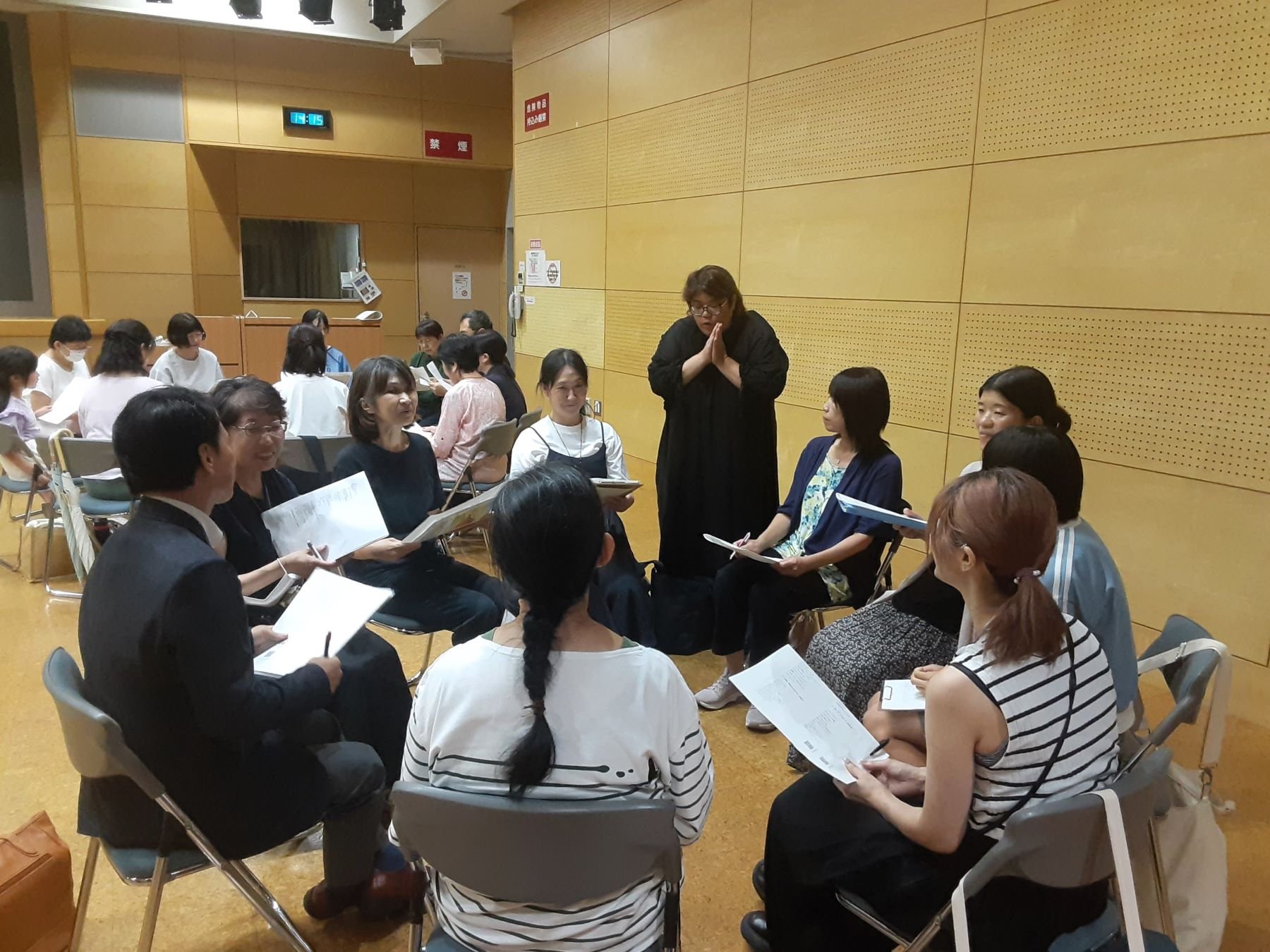 Together with the "Theatrical group Flat", participatory reading session was held in which participants read aloud poems about the atomic bomb written by children. Divided into small groups, participants practiced reading while reflecting on the feelings of the children who wrote the poems.