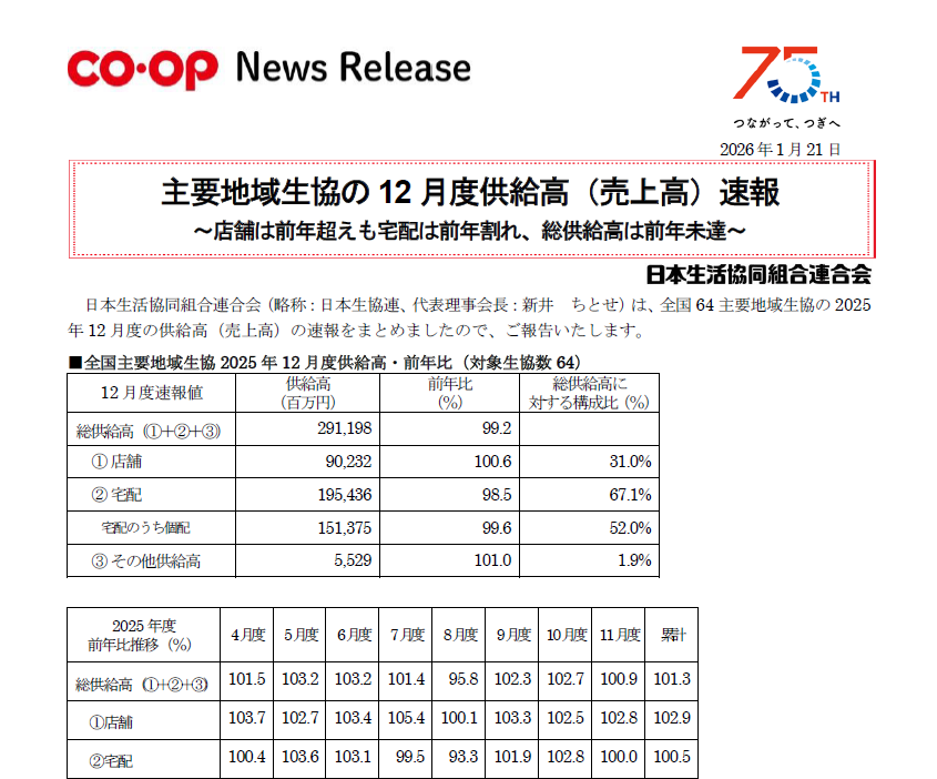 ニュースリリース - 主要地域生協の12月度供給高(売上高)速報 ~店舗は前年超えも宅配は前年割れ、総供給高は前年未達~