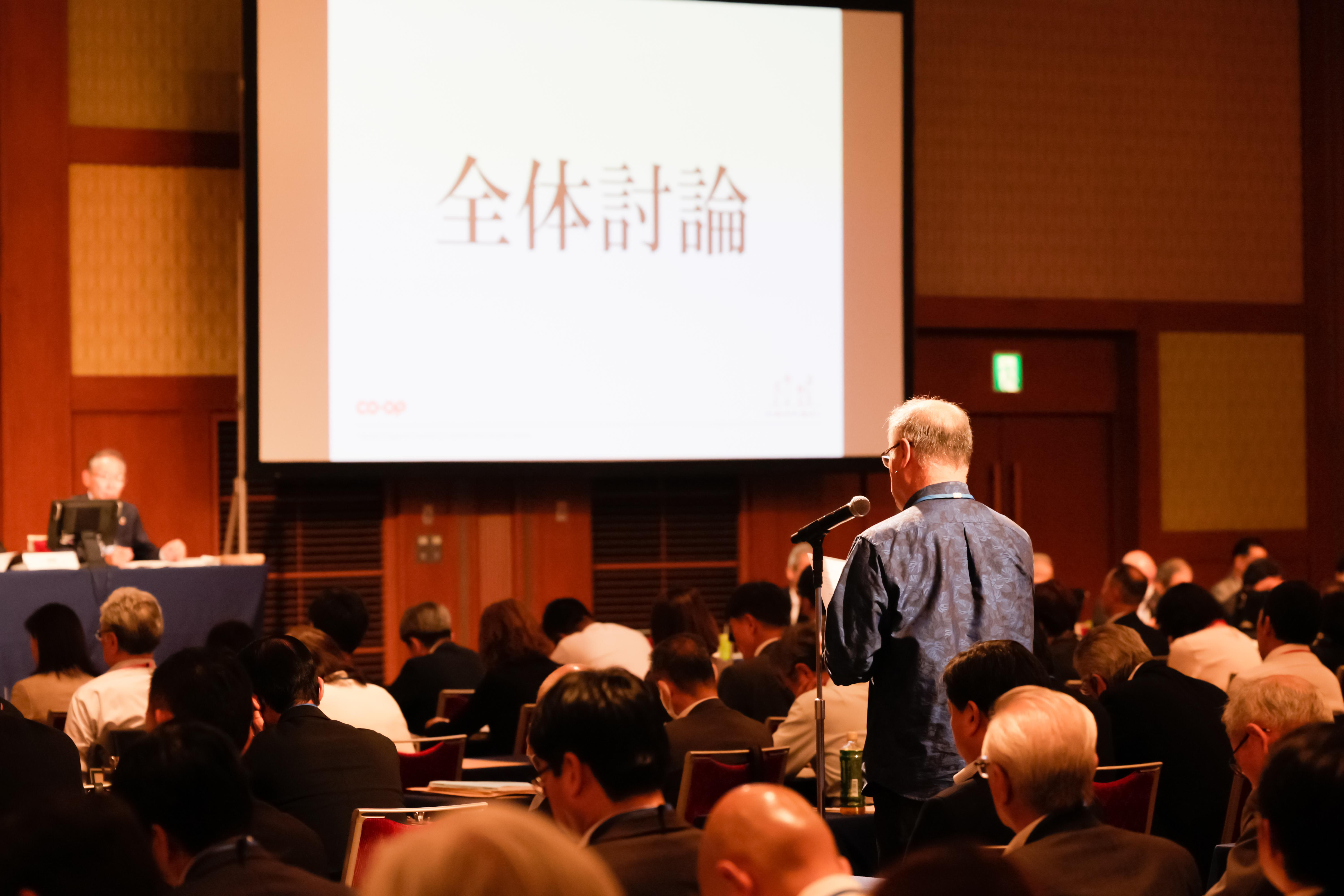 議案提案後の全体討論では、15人の代議員から発言がありました。その一つとして、被爆80年の2025年が国際協同組合年であることとも連動し、行政や全国の生協・諸団体と連携して草の根活動を推進していく具体的な取り組みとして、2025年8月開催の「ピースアクションin ヒロシマ」「ピースアクションin ナガサキ」への結集を呼びかける発言がありました。その他、震災から1年6カ月が経過した能登半島地震の被災地を長期的に支援する取り組みや、地域に愛される店舗づくりの事例、新規出店に伴う次世代人財育成、農作業を通じ自分事として農業に関心を持つ人を広げる取り組み、地域と共に創り上げた買い物支援、住み慣れた地域で暮らし続けるための福祉事業、若い世代へ生協を広げる為の取り組み、新たなシステム開発を機とした大学生協の状況と展望などについて報告があり、幅広いテーマで議論が行われました。