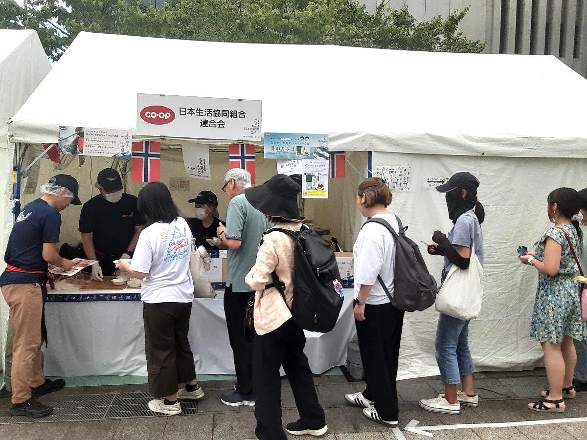 2025年9月19日~20日の2日間、日本生協連は、東京ソラマチ(東京都墨田区)で開催された「ノルウェーシーフードフェス2025 」に参加しました。これはノルウェー大使館 水産部の主催イベントで、JALグループ含む5企業が協力したものです。13団体が出店し、日本生協連のブースでは2日間で計約500食の「CO・OP骨取りさばの味噌煮」を試食提供しました。