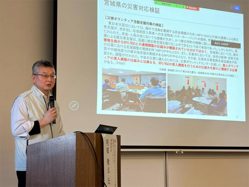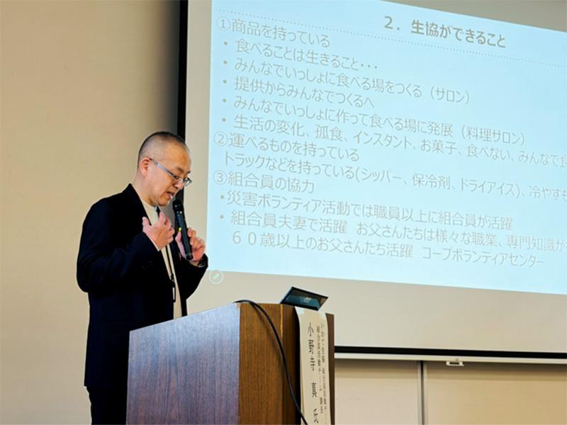 東日本大震災で被災したみやぎ生協・コープふくしまや、いわて生活協同組合(略称:いわて生協)をはじめ、大規模災害を経験した生協を代表して、生活協同組合コープこうべ(略称:コープこうべ)、生活協同組合コープデリにいがた(略称:コープデリにいがた)、生活協同組合くまもと(略称:生協くまもと)、生活協同組合コープいしかわ(略称:コープいしかわ)から、未来に向けて伝えていきたい経験や取り組みについての報告が行われました。また、認定NPO法人全国災害ボランティア支援団体ネットワーク(JVOAD)の明城徹也事務局長より「大規模災害に向けて必要となる備え」をテーマに、これまでの災害支援の経験から明らかになったつながりの重要性や支援の隙間を埋めていく支援の必要性について講演がありました。