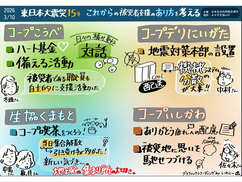 本企画は、東日本大震災から15年の節目にあたり、これまで大規模災害において生協が実践してきた被災者支援活動の特徴や価値について学び、次世代へ継承していくことと、これからの被災者支援や社会的な仕組みづくりに生協が果たすべき役割を話し合うことを目的としています。
