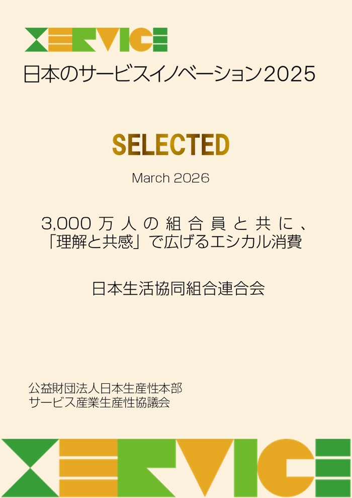 日本生協連の取り組み「3,000万人の組合員と共に、『理解と共感』で広げるエシカル消費」が、「日本のサービスイノベーション2025」に選定されました。