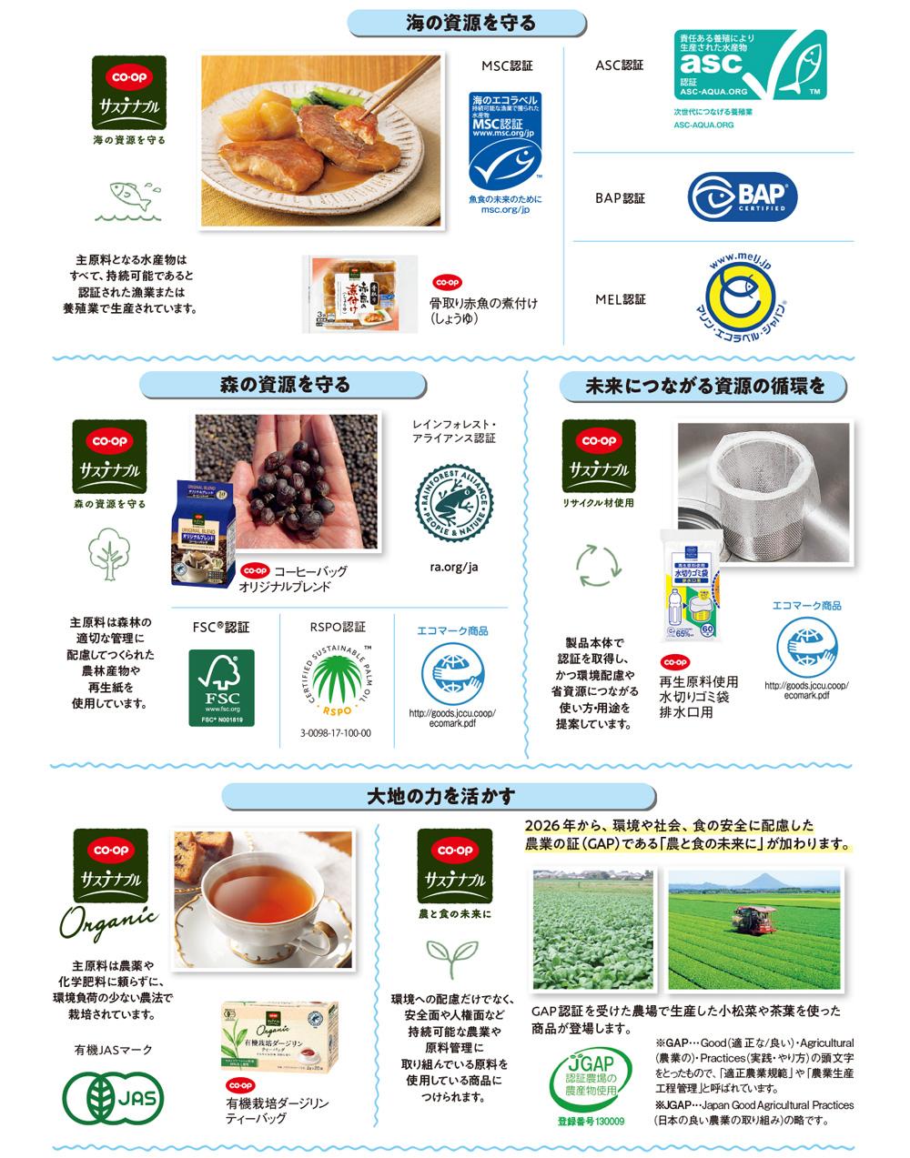 コープ商品の「エシカル消費対応商品」の中から環境や社会に配慮した主原料を使った商品を、「コープサステナブル」という共通のロゴマークを付けてシリーズ化し、商品が何に配慮しているかを一目で理解できるよう4つのテーマを設定しています。