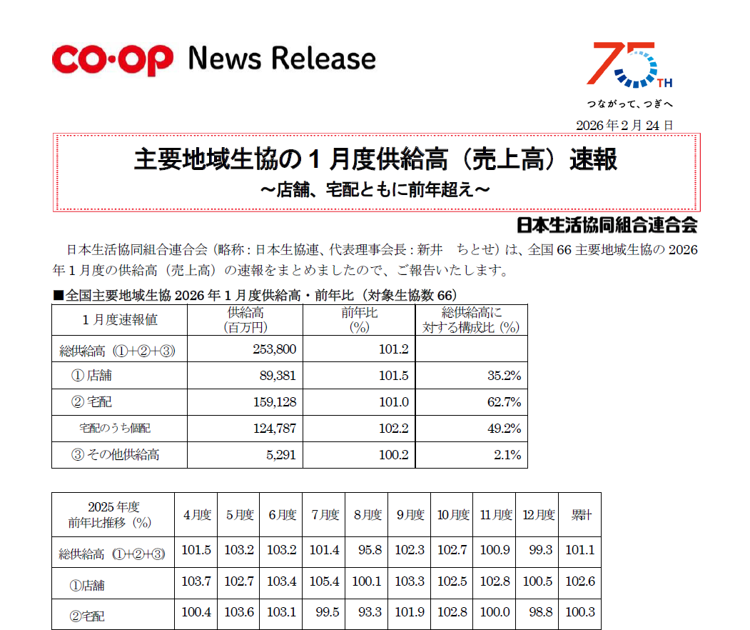 - 主要地域生協の1月度供給高(売上高)速報 ~店舗、宅配ともに前年超え~